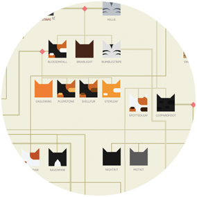 Working on Warriors was a joy and a privilege and a challenge, and I still count myself one of the luckiest people in the world to have been a part of its creation. But oh my goodness, I WISH I had made some family trees at the very beginning! I would be richer than my wildest dreams if I had a pound for every time I’ve been asked who Graystripe’s parents were, or Dustpelt’s, or Spottedleaf’s, or… The honest truth is that we didn’t give a moment’s thought to parents or littermates when I came up with the cast lists for the first series. We simply came up with a nice cat’s name whenever we needed a new character. We didn’t dream that these cats would exist beyond a single generation, into several lifetimes of stories. I thought I was breaking new ground by keeping a record of fur and eye colour! And look at the errors I made there, even though I promise I tried REALLY HARD to keep everything consistent.