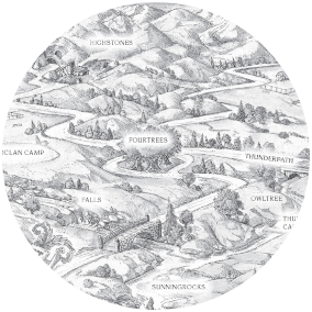 It is no secret that I am terrible at drawing. Those of you who have met me on tour will know that I offer to draw a small fat cat or a small fat sheep in your books if I am asked to provide an illustration. But I have always loved maps, and even now I still like to check the GPS (satellite navigation) in my car against a road atlas before I start a new journey. The first Warriors book was based on a very sketchy image of four territories divided top to bottom by a river and left to right by a road, and that was it. I think Highstones were stuck somewhere near the top margin, and I drew some boxes with roofs to indicate the town where Rusty came from.