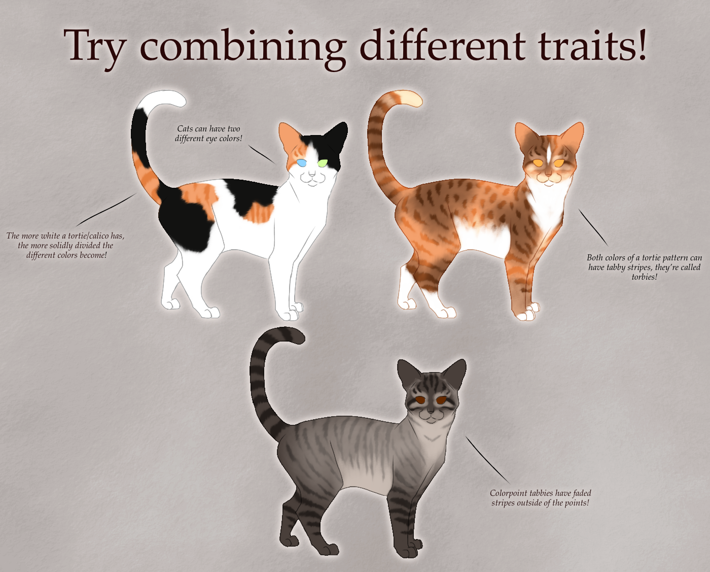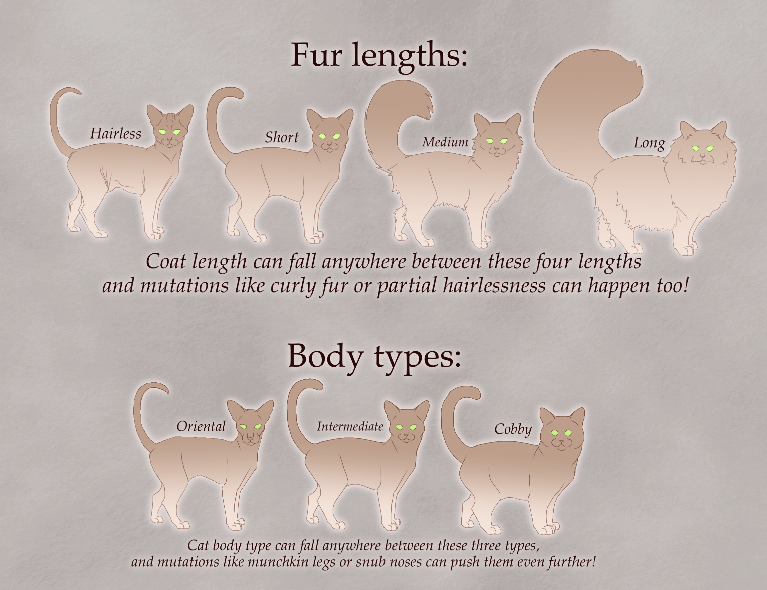 There are so many options when designing a cat, from coloration, to pattern, to build and fur length! Here are some handy visual tips on ways you can design the look for your feline character!