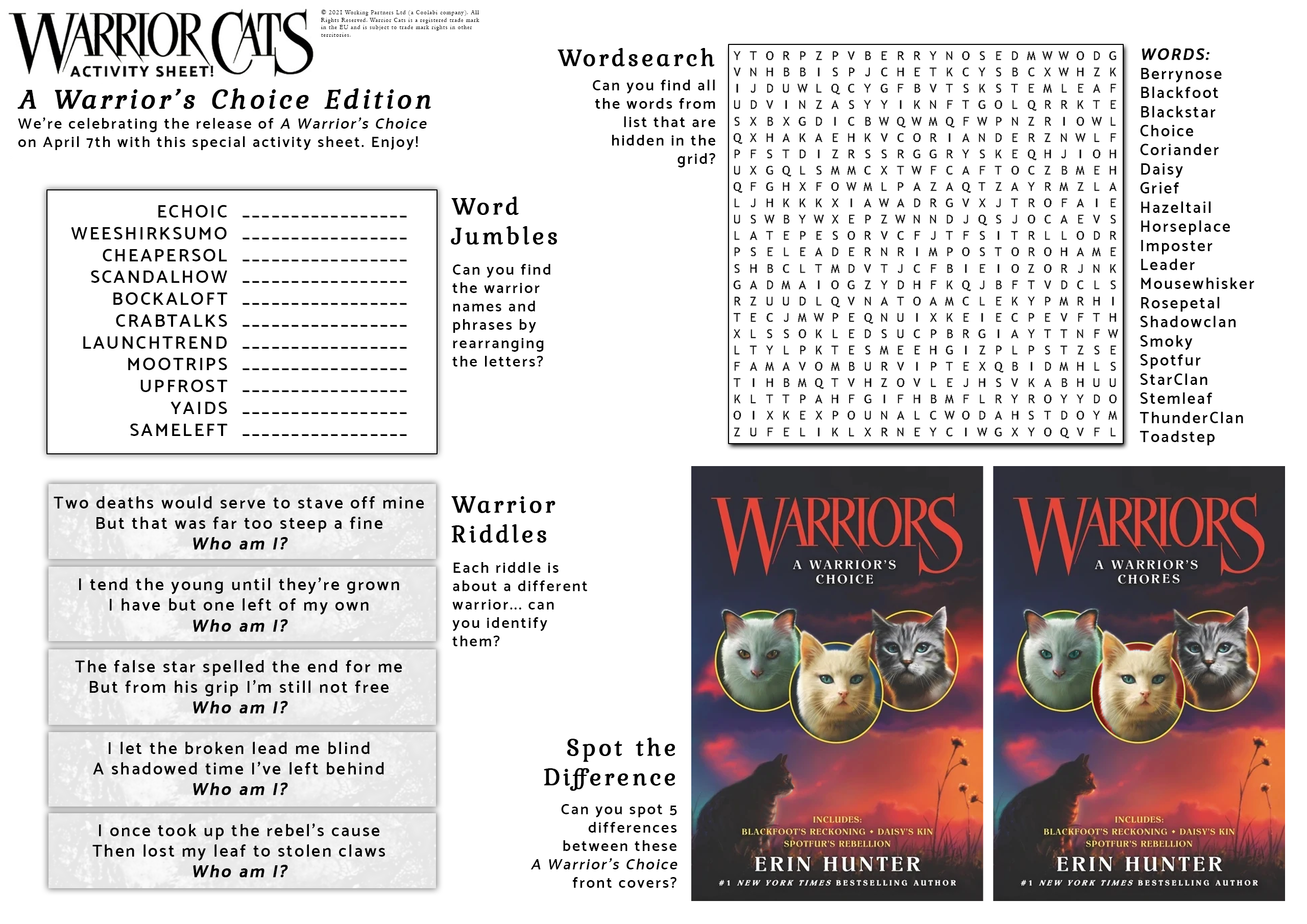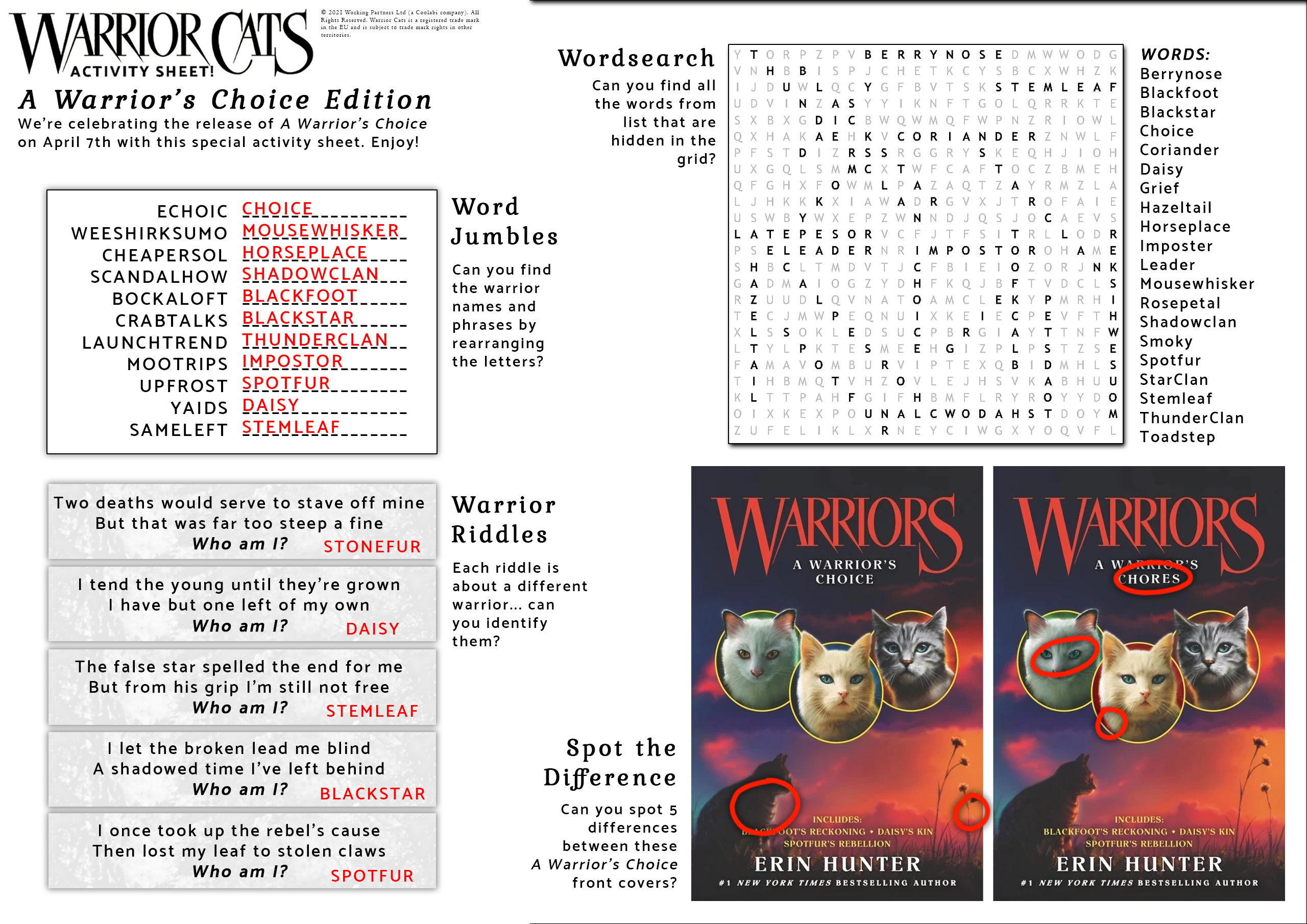 As we celebrate the recent releases of A Warrior’s Choice and The Place of No Stars, we figured we’d give you guys a fun new TPONS-themed activity sheet to play with! Seek out the wintery terms on our word search, unscramble some frosty names in our world jumble, test your warriors knowledge with our seasonal crossword, and break out the colored pencils, markers, or artistic tool of your choice to help give Jayfeather some festive color,