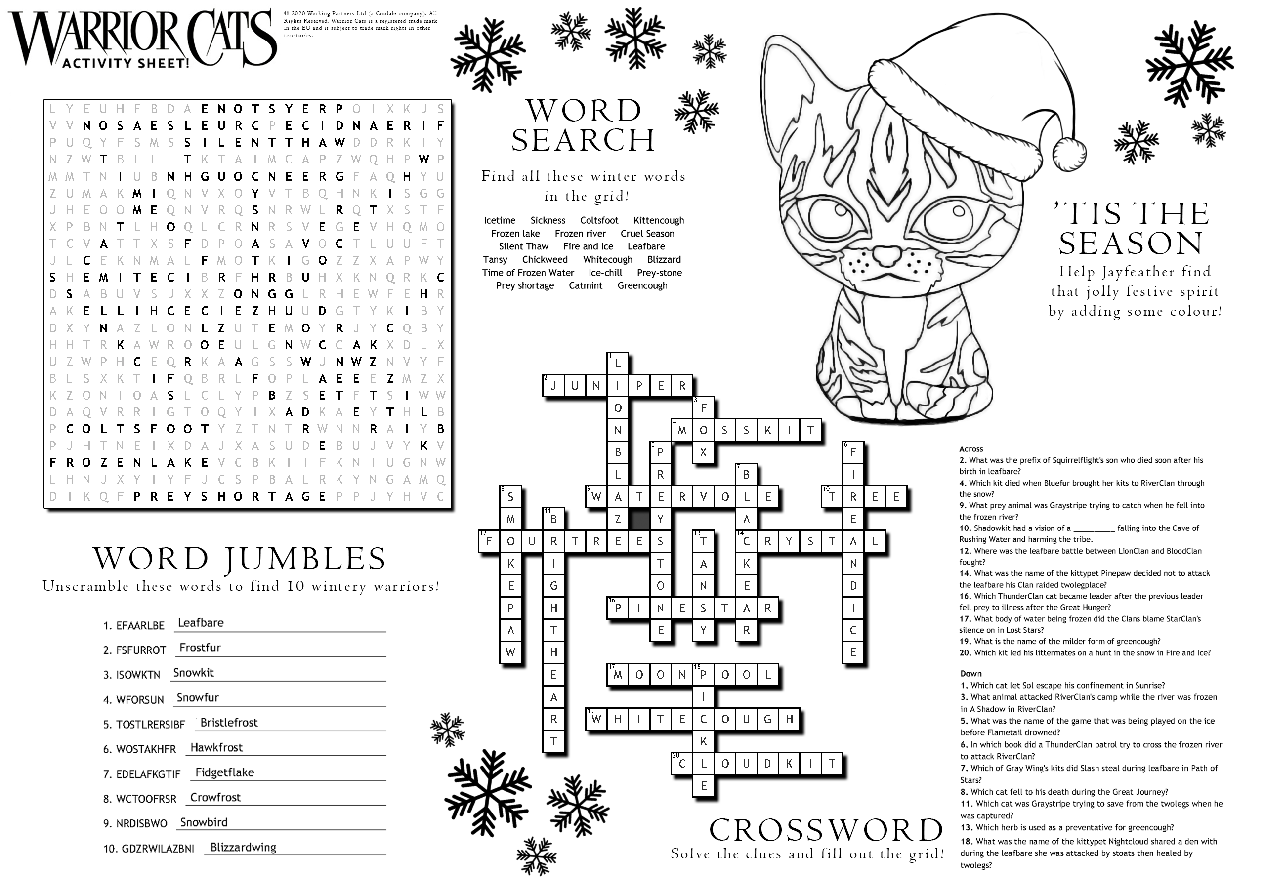 As a rather interesting year comes to a close, we decided to give you guys one last holiday surprise with a special holiday edition of the Warriors activity sheets! Seek out the wintery terms on our word search, unscramble some frosty names in our world jumble, test your warriors knowledge with our seasonal crossword, and break out the colored pencils, markers, or artistic tool of your choice to help give Jayfeather some festive color,