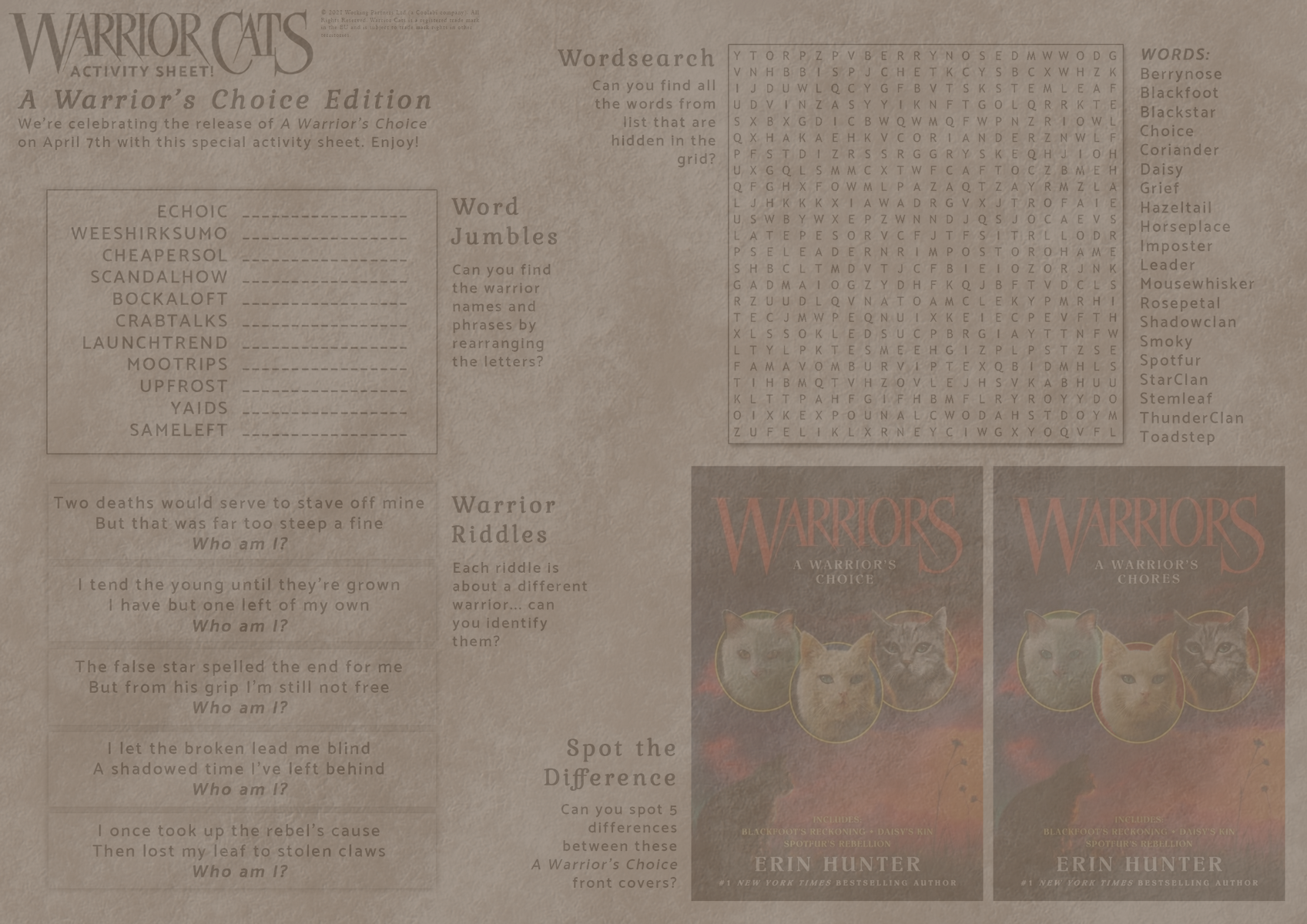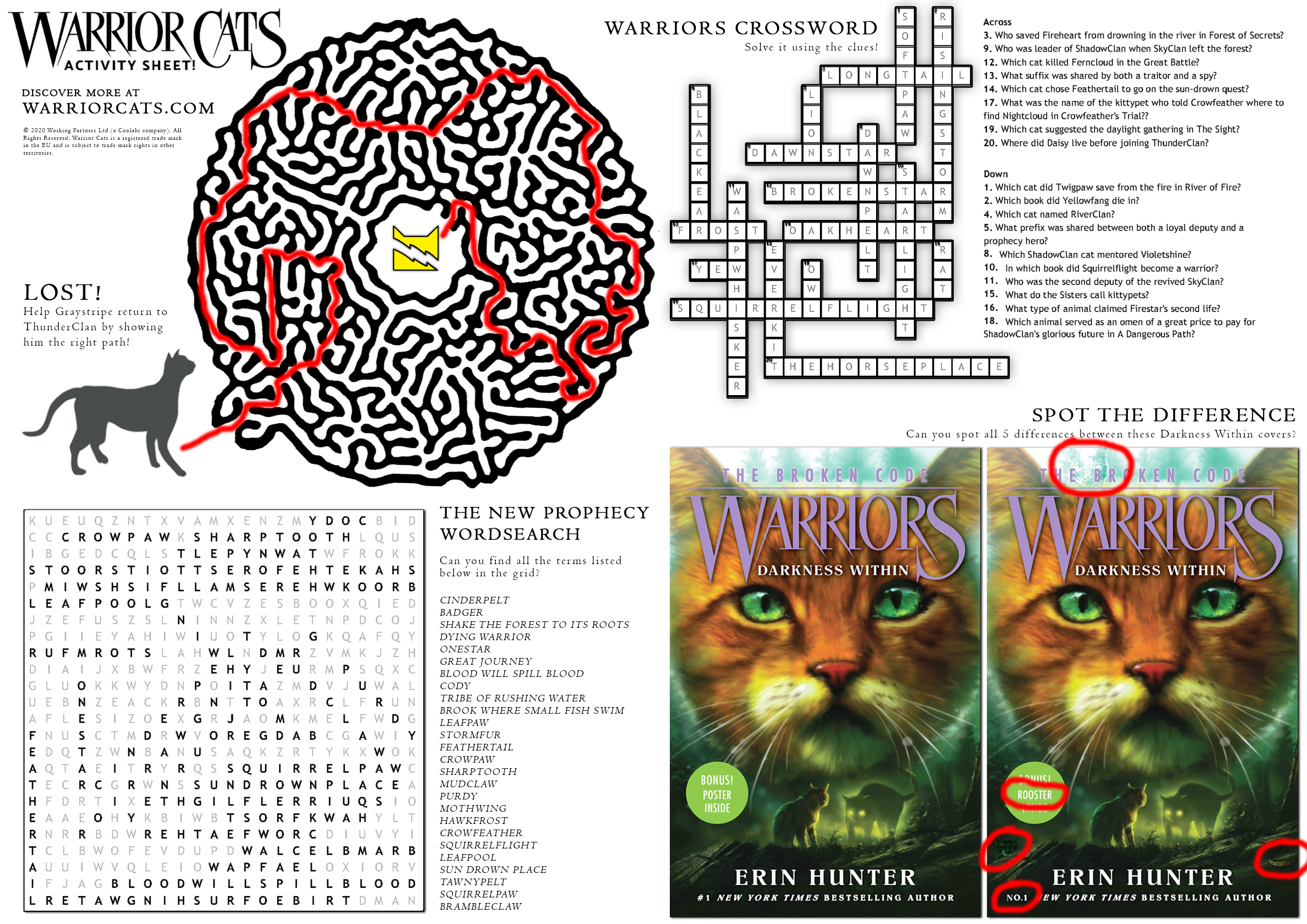 We figured it’s been a while since we’ve done an activity sheet, so here’s a brand-new one for you guys to enjoy! Test your Warriors knowledge with our crossword, help loyal elder Graystripe find his way home with our maze, relive the days of The New Prophecy with our word search, and keep a sharp eye out for differences between the two Darkness Within covers.