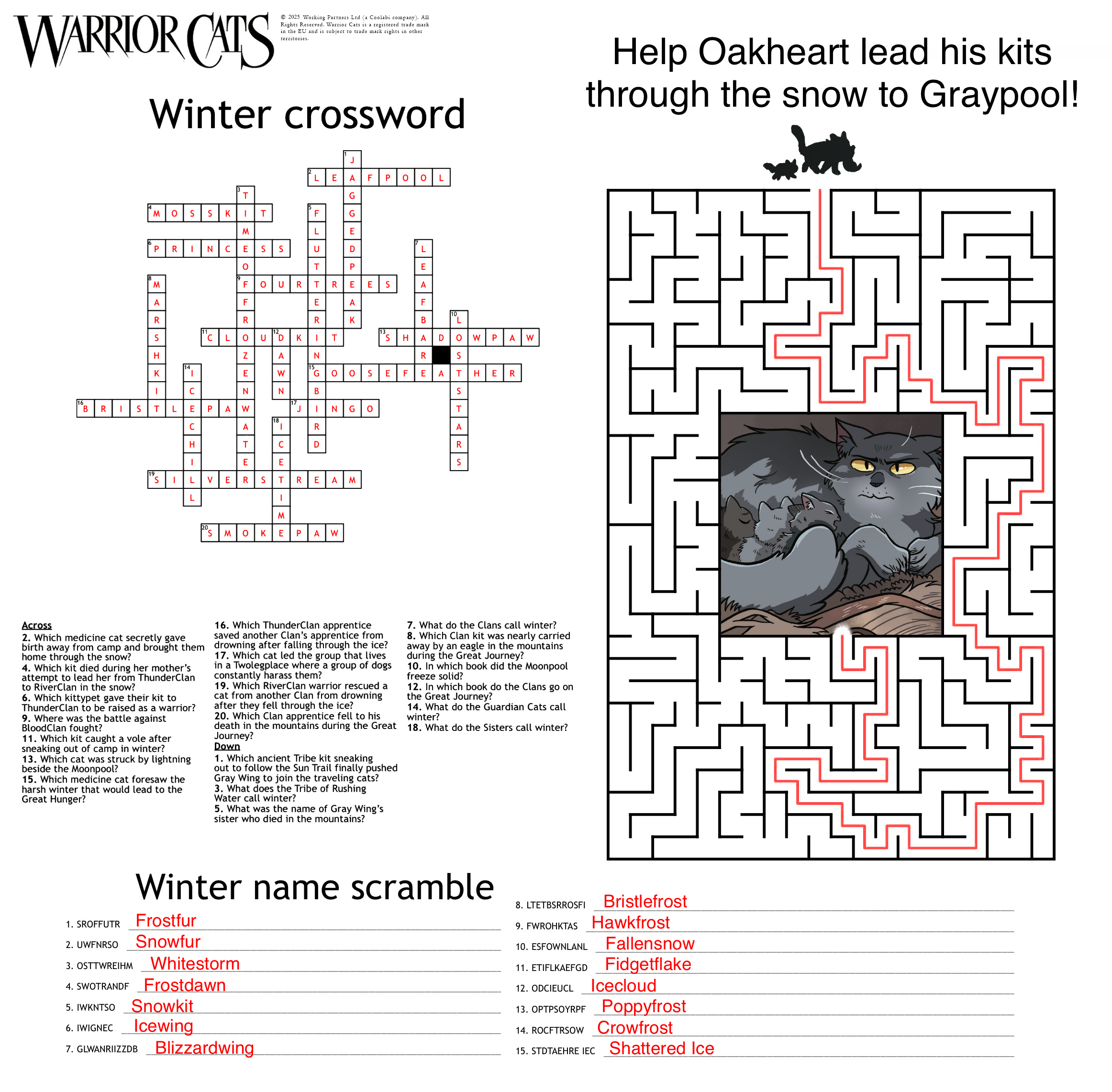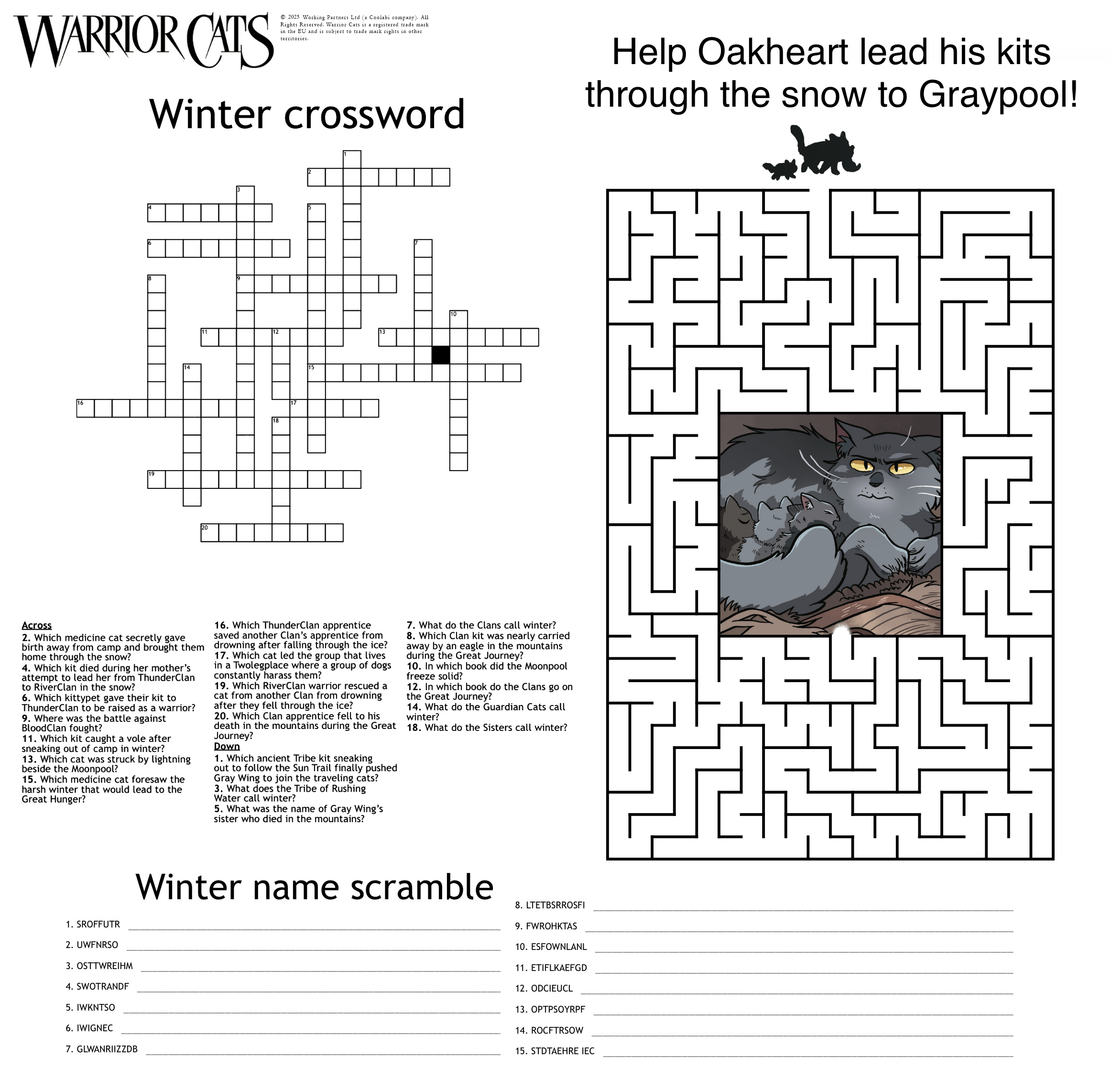 As a special treat for the winter season, we have a new activity sheet covering winter-related characters and events from the whole series up to this point! Test your winter knowledge with our crossword, unscramble the winter-related character names with our word scramble, and lead Oakheart through the snowy maze so he can bring his kits to Graypool!
