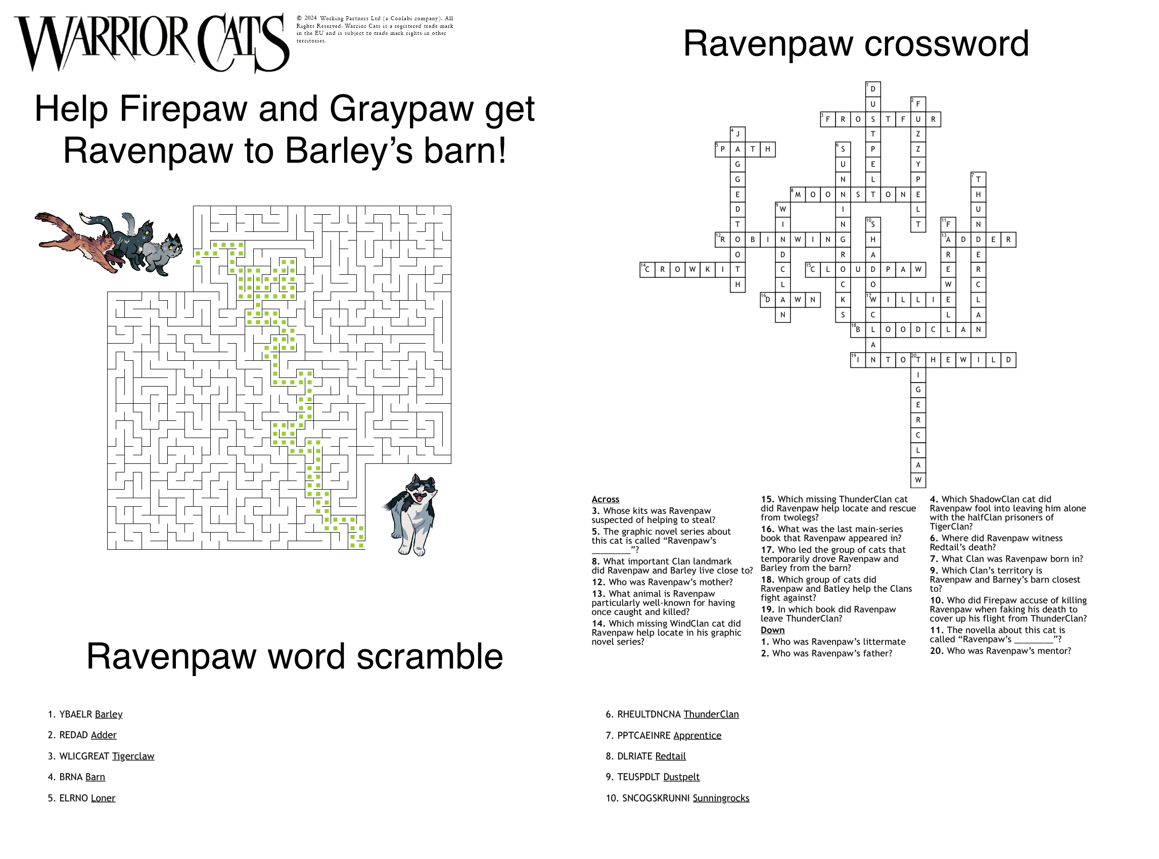 It’s time for another new activity sheet, this time about our favorite barn cat! Test your Ravenpaw knowledge with our crossword, show your Ravenpaw trivia chops with our word scramble, and solve the maze to help Firepaw and Graypaw get Ravenpaw to safety at Barley’s barn!