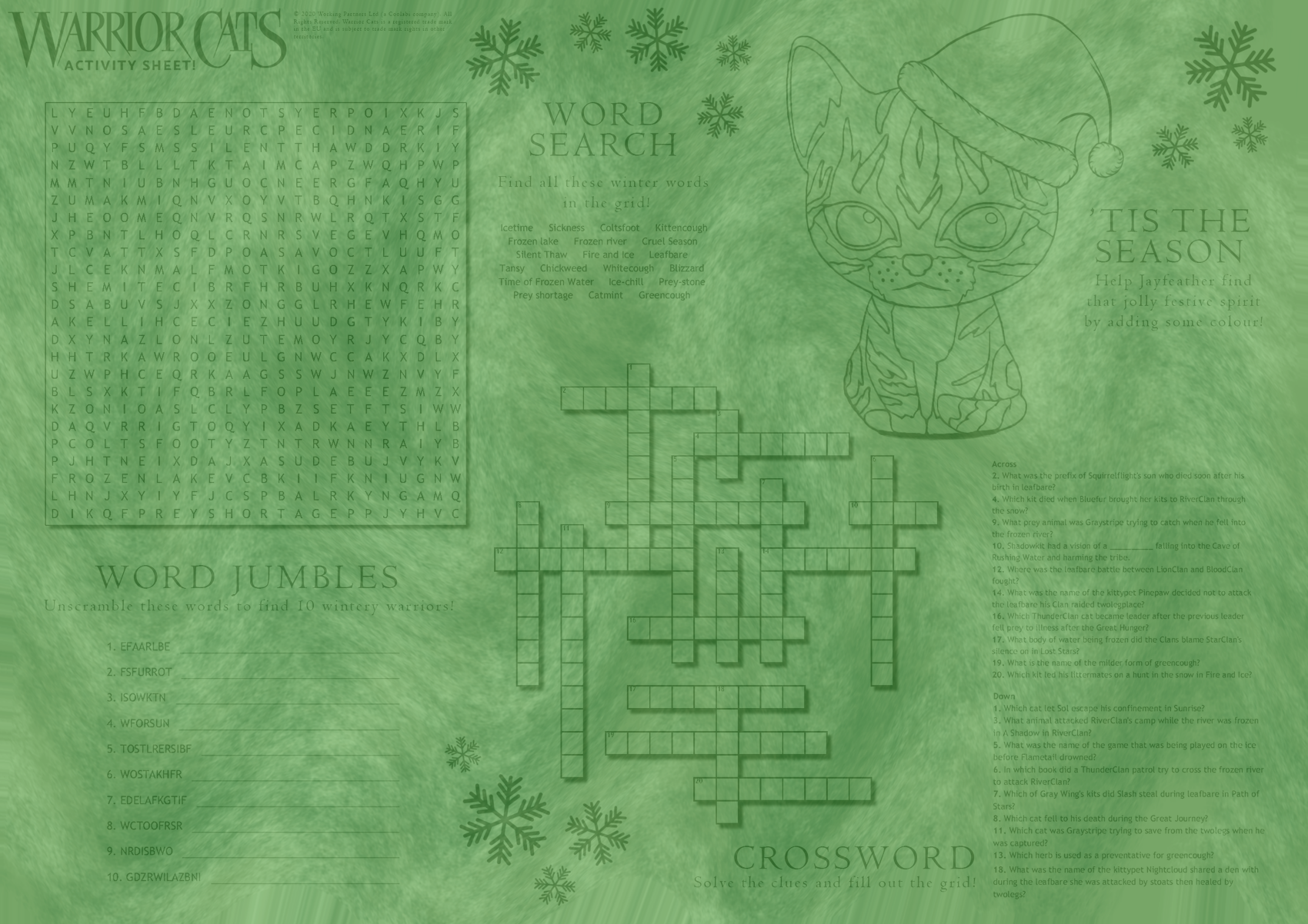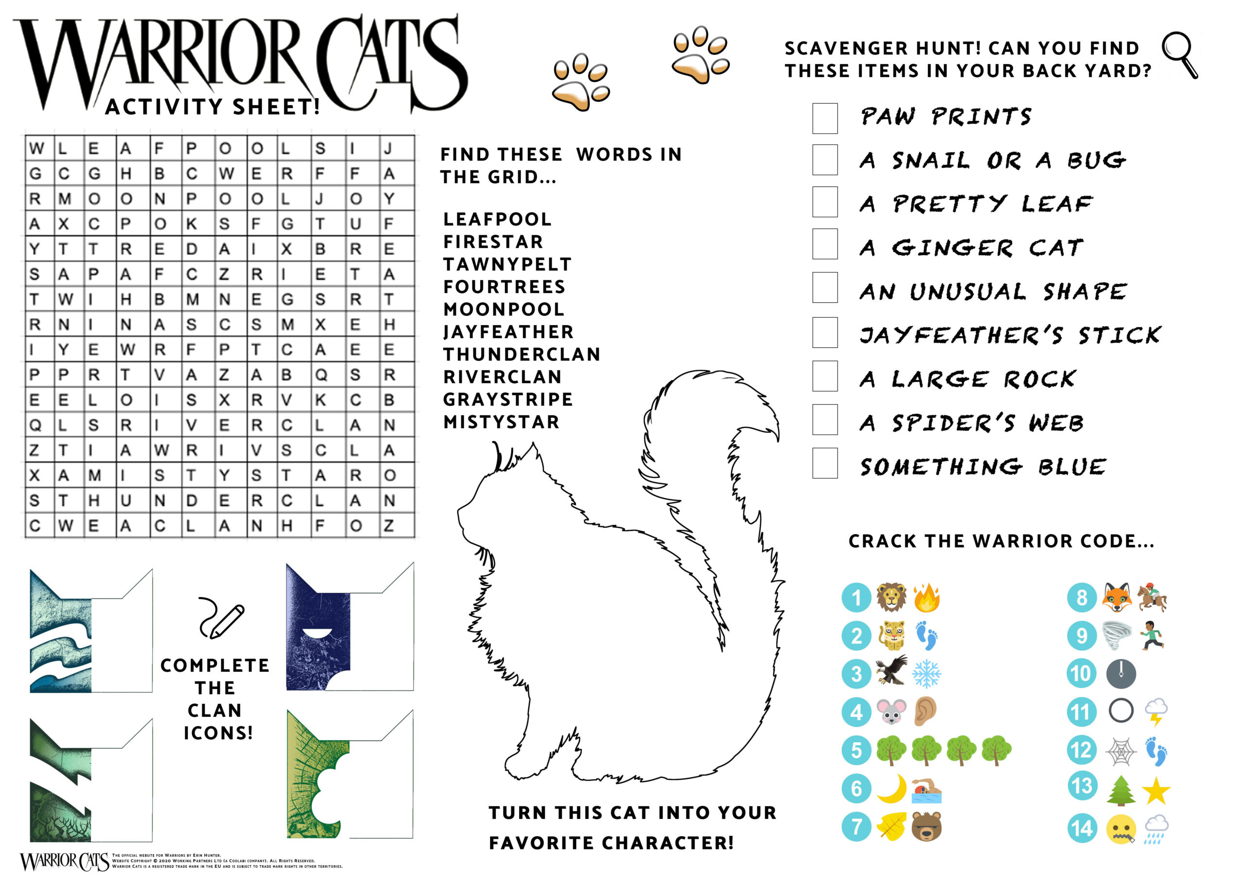 We’ve created a challenge-filled worksheet to print out and keep you busy with a range of Warrior Cats activities. Whether it’s with a scavenger hunt in your back yard, or a taxing wordsearch from the comfort of your couch, we’re hoping to keep you entertained for hours.