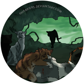 The initial exiled elders were Nightpelt, Hollyflower, Crowtail, Poolcloud, and Archeye. Featherstorm came to join them after the death of her son Mosspaw, when Brokenstar forced her into retirement so she couldn’t protest the early training of her other kits. After that, Brokenstar started using the den as a way to “retire,” or quietly shuffle out of view of camp, any cats who dared stand up to him. ShadowClan warriors Ashfur and Dawncloud were included among these exiles. Featherstorm’s other son Volepaw came to join them after Clawface and Runningnose faked his death for the rest of the Clan, then Brightflower followed after the deaths of her kits, Mintkit and Marigoldkit. The elders passed a leafbare and a newleaf in their new home, until they were finally able to win back their place in the main camp by overthrowing Brokenstar. After that, the den that had seen them through that hard time was abandoned though never forgotten by those who were once sheltered by it.